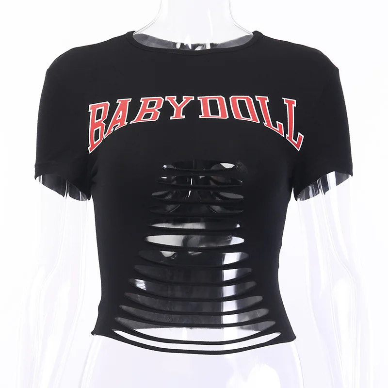 Письмо с принтом в стиле панк, готика хлопковые футболки Летние Для женщин пустое отверстие короткие футболки для девочек короткие футболк...