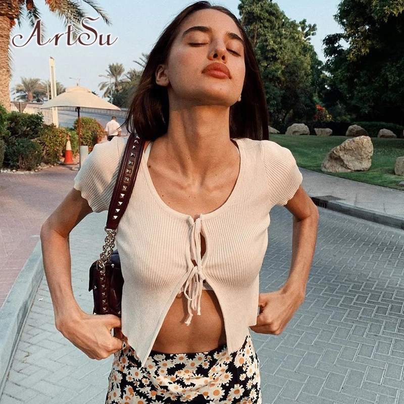 ArtSu сексуальный укороченный топ, футболка на шнуровке с коротким рукавом, тонкая женская мода, Летняя Сексуальная футболка уличная одежда ASTS21615