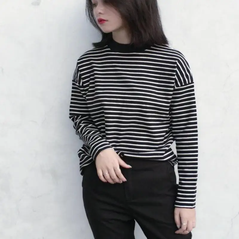 Новая Женская водолазка в Корейском стиле Футболка Harajuku с длинными рукавами Топы в полоску Женская футболка на лето и весну повседневные то...