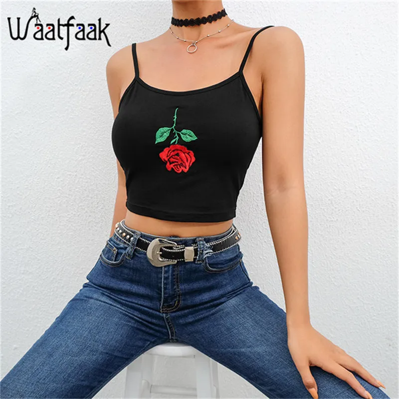 Женский топ на бретельках Waatfaak, черный топ с открытой спиной и вышивкой, Укороченный хлопковый топ без рукавов с открытыми плечами