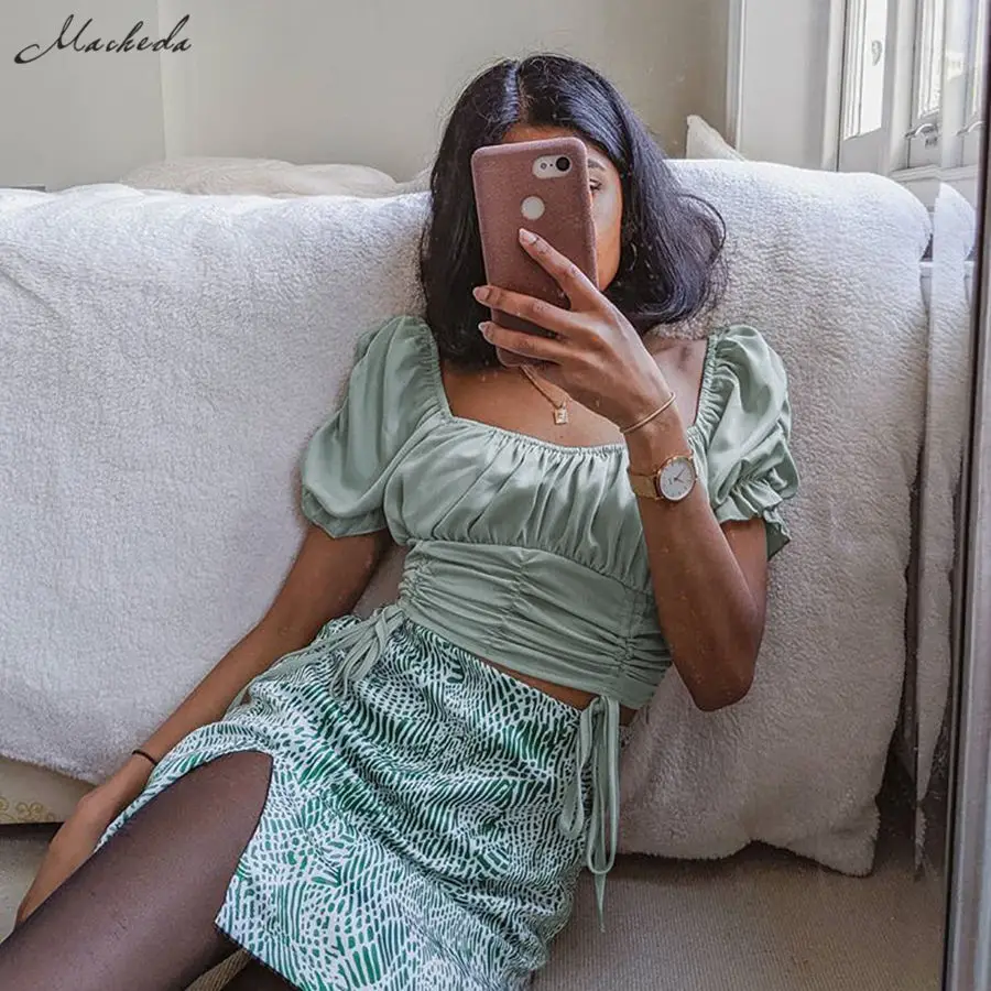 Macheda женский трендовый Зеленый Французский романтичный плиссированный приталенный кроп-топ 2020 Новый повседневный элегантный уличный топ с...