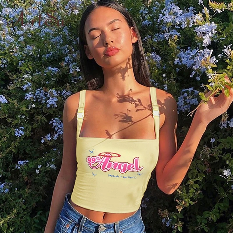 Арцу 99%, топы с принтом ангела, желтые топы с милым принтом, майки, женский укороченный топ с открытыми плечами, топы, футболки, эластичные, ASVE60791