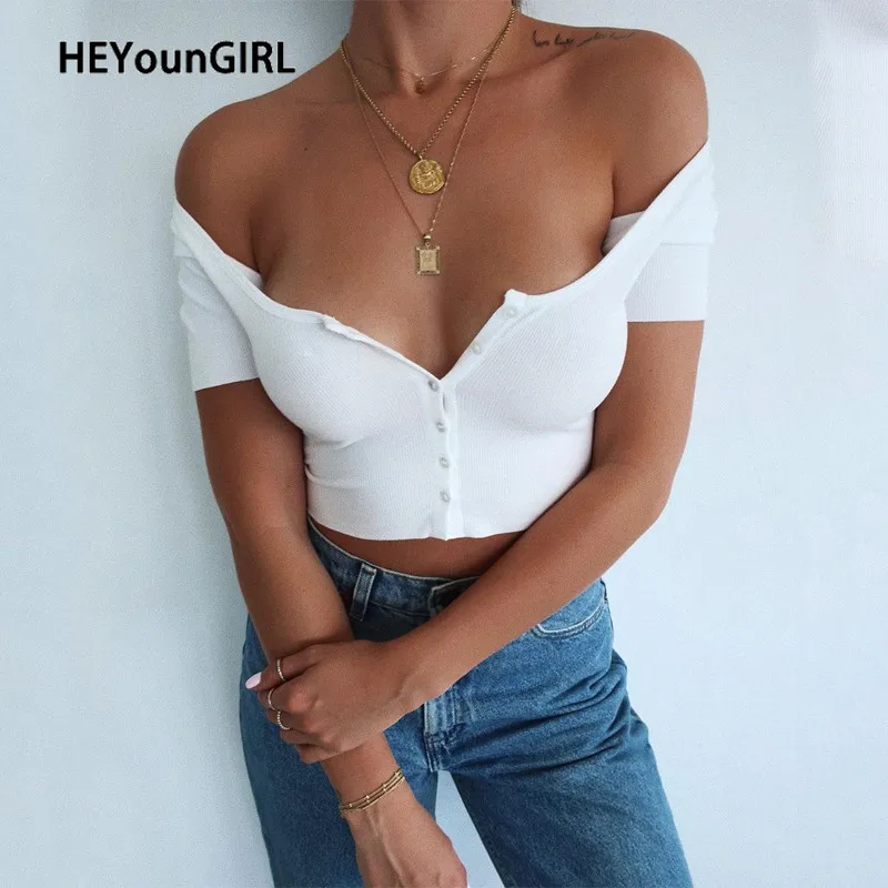 HEYounGIRL черная белая Повседневная укороченная Футболка женская ребристая Однотонная футболка с коротким рукавом женская уличная футболка с пуговицами 35% хлопок