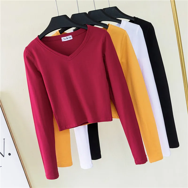 Осенняя Хлопковая женская одежда больших размеров с v-образным вырезом и длинным рукавом, тонкие базовые короткие футболки, женская модная повседневная Уличная одежда