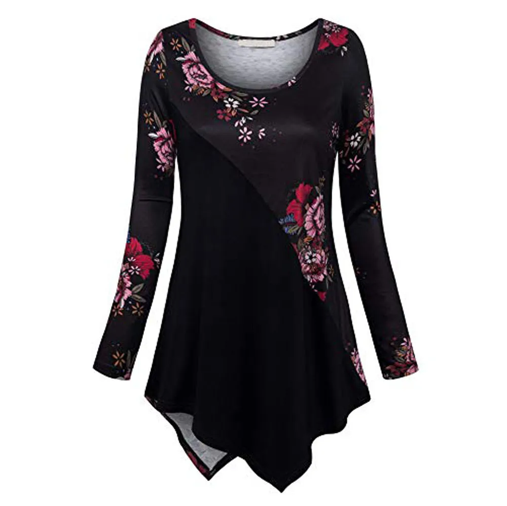 С длинным рукавом рубашка с принтом для женщин; Большие размеры Кнопка o-образным вырезом пуловер Топы женские печатных шею Панель топ с дли...