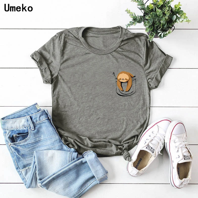 Umeko 2020 милые футболки с принтом животных из мультфильма «Ленивец» для женщин, повседневная Милая футболка с круглым вырезом, женская летняя футболка, Топы, одежда для женщин