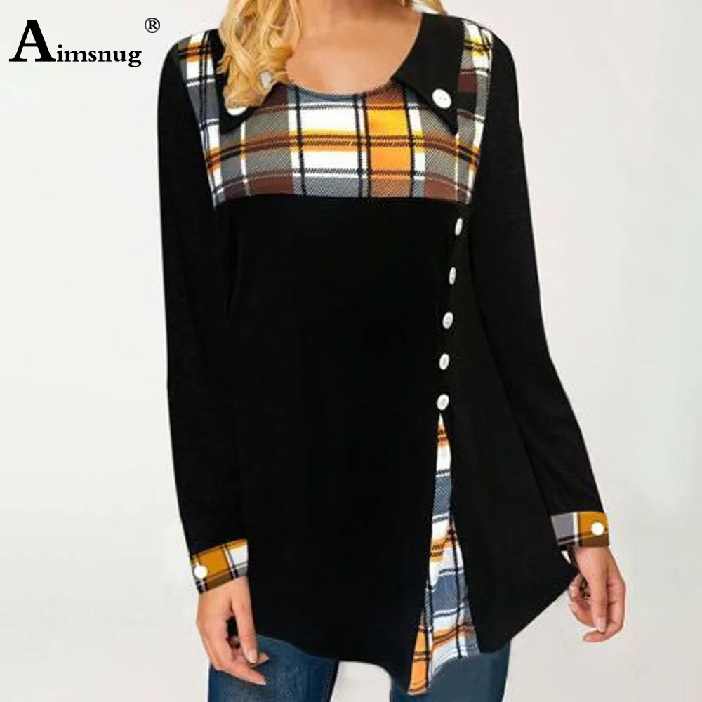 Aimsnug размера плюс 5xl Лоскутная клетчатая футболка с принтом для женщин с длинным рукавом 2020 Новая летняя рубашка Футболки женские топы с кнопками 3D футболка