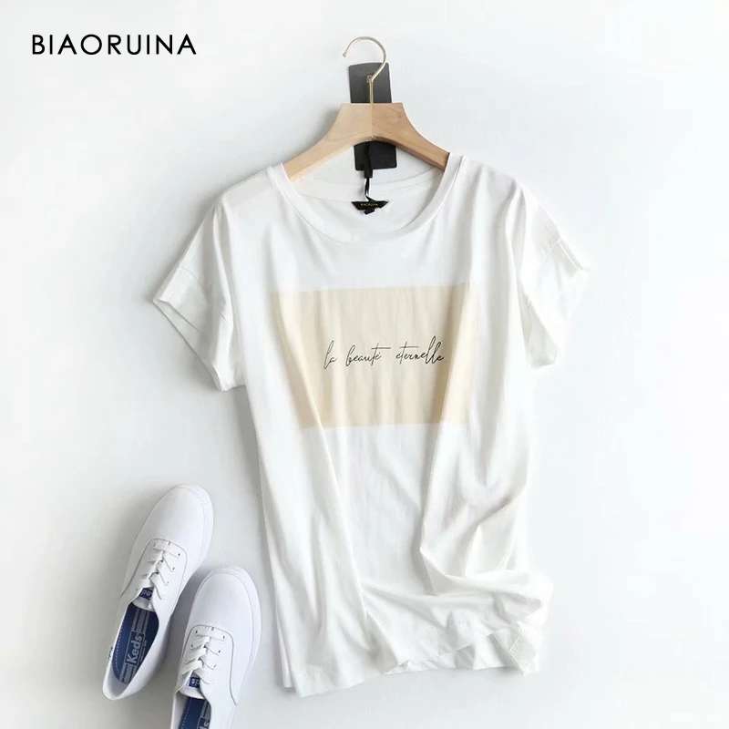 BIAORUINA женская футболка с круглым вырезом и буквенным принтом, повседневная хлопковая летняя футболка с коротким рукавом, Женские Удобные Свободные модные футболки, топы