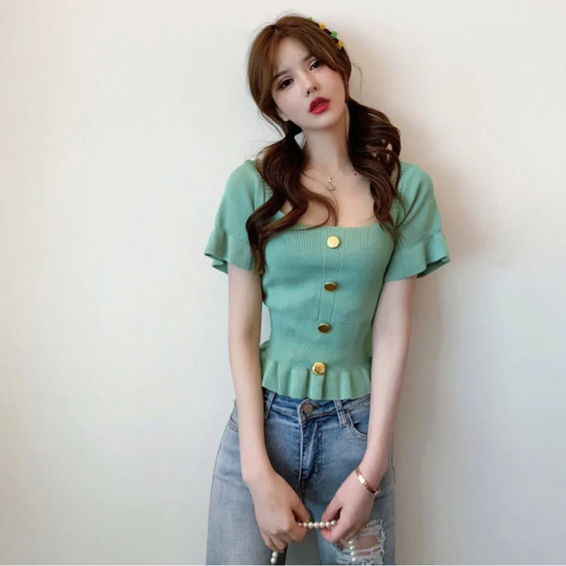 Новинка 2019, летняя женская футболка, одноцветная, Вязанная, повседневные топы, женская футболка с квадратным воротником, на пуговицах, с пыш...