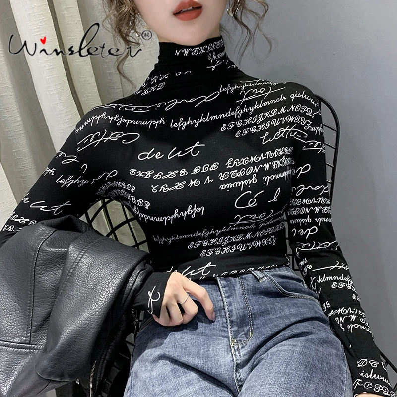 Винтажные топы с принтом, футболка с буквенным принтом, Весенняя женская облегающая футболка из эластичной ткани с высоким воротом и длинным рукавом, повседневная одежда T01407B