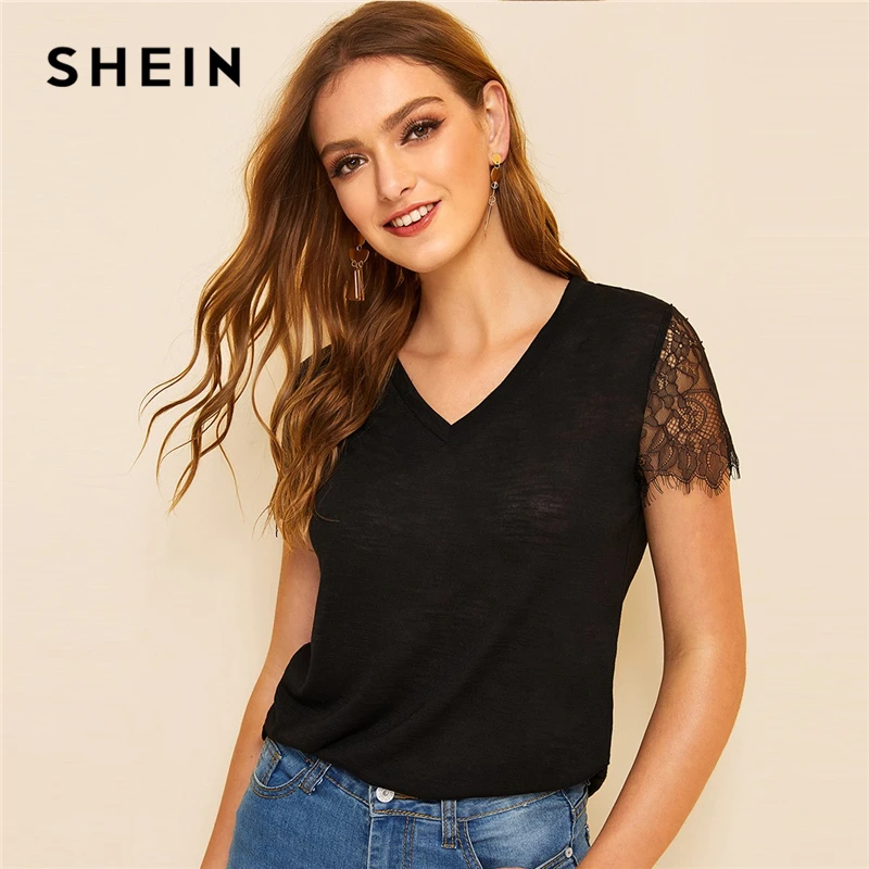 SHEIN повседневный черный или белый кружевной топ с отделкой ресниц, женская летняя футболка с v-образным вырезом и коротким рукавом, однотонн...