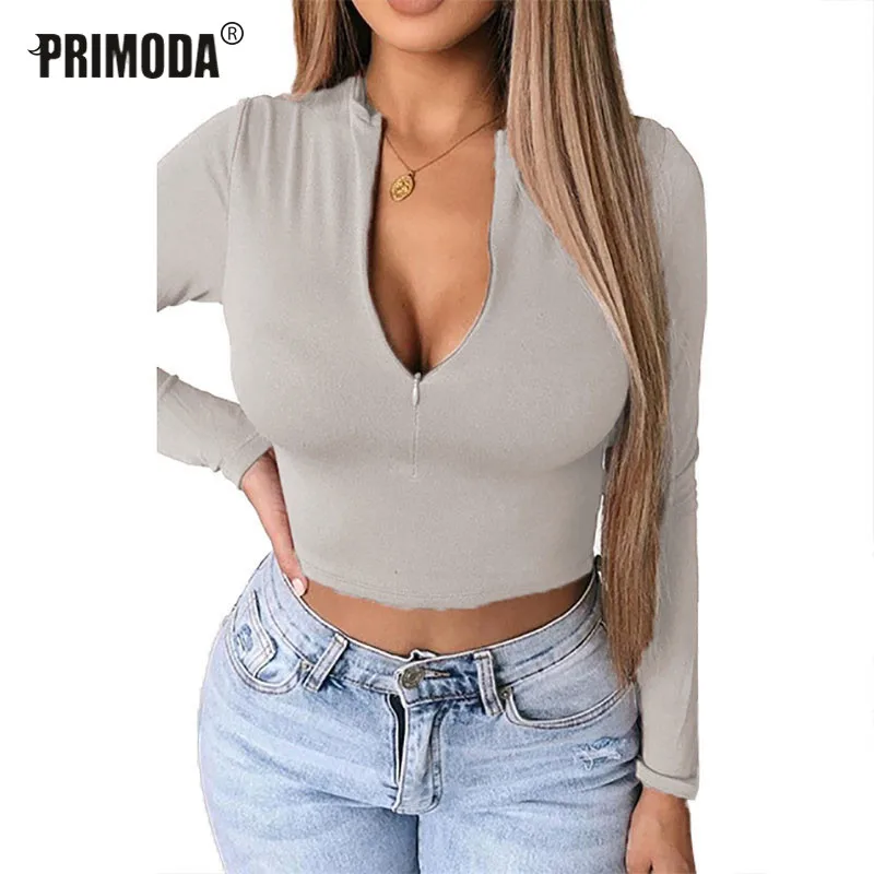 Серая Черная Женская Футболка Harajuku 2019, осенне-зимние короткие топы, сексуальные хлопковые базовые Клубные футболки на молнии с длинным рука...