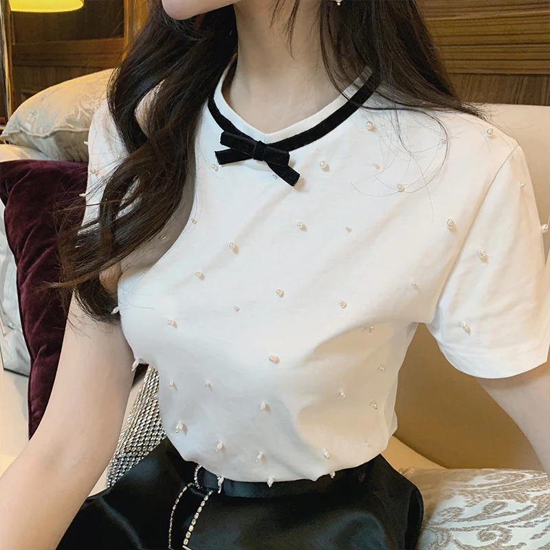 Новинка лета 2020, белая трикотажная футболка с круглым вырезом и галстуком-бабочкой, Высококачественная женская футболка с коротким рукавом ручной работы, украшенная бусинами и жемчугом
