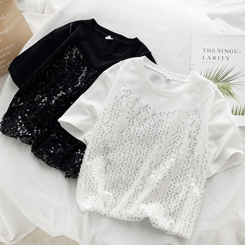 Женские белые и черные летние футболки 2019, harajuku, с блестками, одноцветные, с коротким рукавом, повседневные, свободные, сексуальные футболки, модные, имитация двух частей, топы