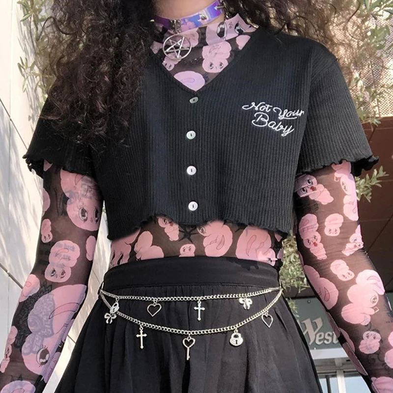 Женская футболка Goth Dark, винтажный укороченный топ с вышивкой и оборками, с треугольным вырезом, 2020