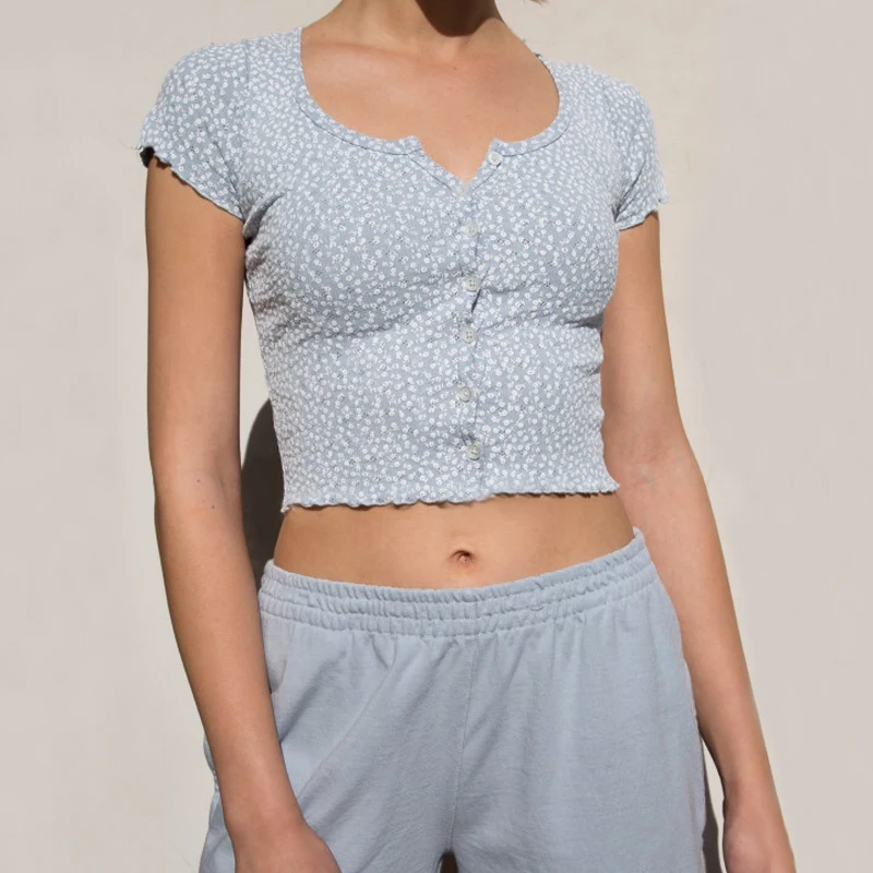 Женская укороченная футболка с коротким рукавом и цветочным принтом на пуговицах