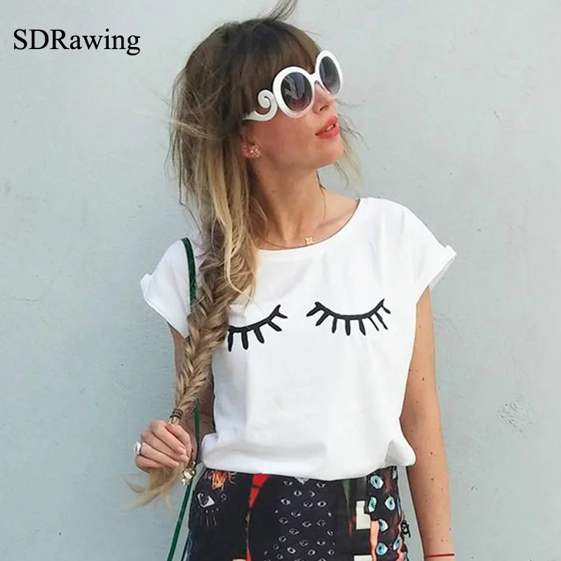 Забавные ресниц принт Для женщин футболка хлопок Повседневное забавная футболка для Леди Топ для девочек Футболка Hipster Tumblr Прямая поставка