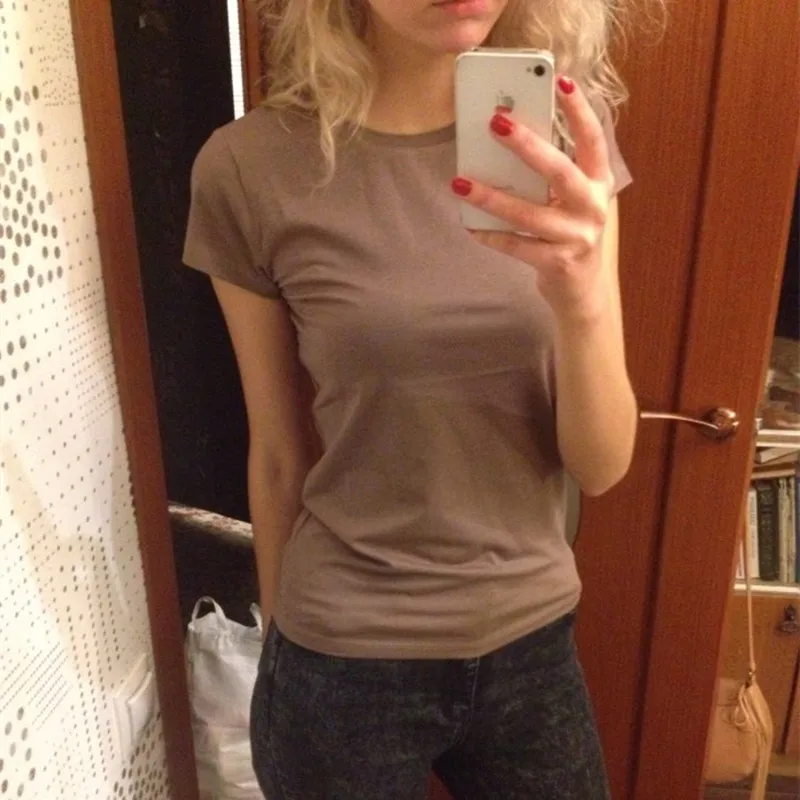 Новое поступление модных женских коричневых футболок, летние однотонные Простые Топы с коротким рукавом, женская футболка размера плюс