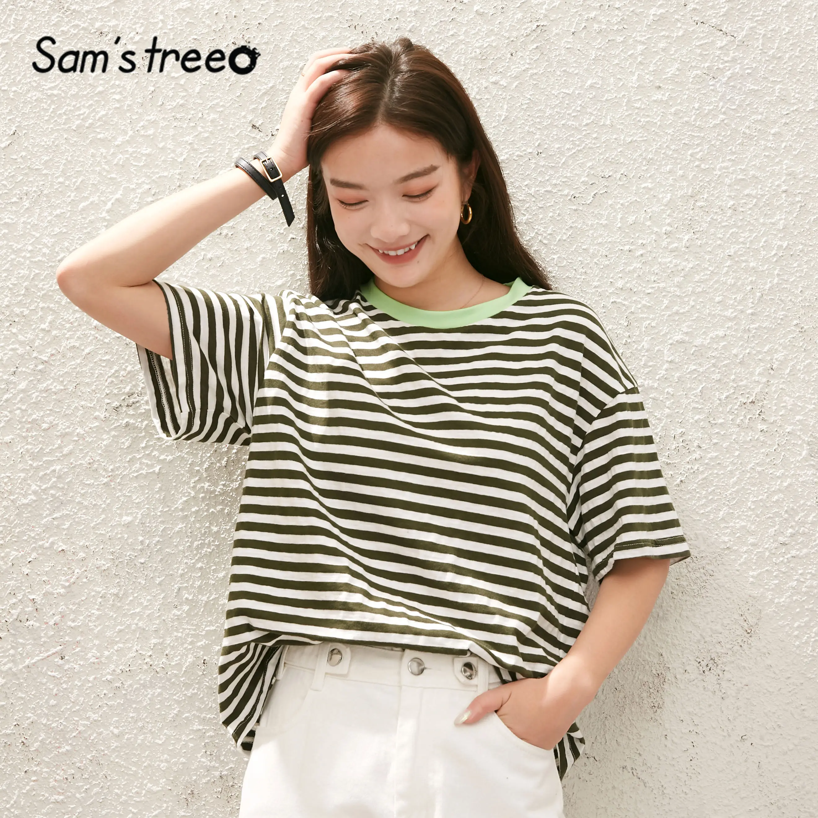 Женские повседневные футболки в полоску SAM'S TREE, зеленые повседневные футболки с коротким рукавом в Корейском стиле, лето 2020
