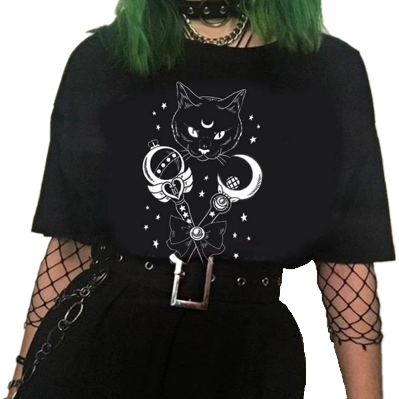 Женская футболка в стиле панк, готика, Kawaii, мультяшный принт, короткий рукав, круглый вырез, Свободный Топ, Футболка Harajuku, модная, темная, гран...
