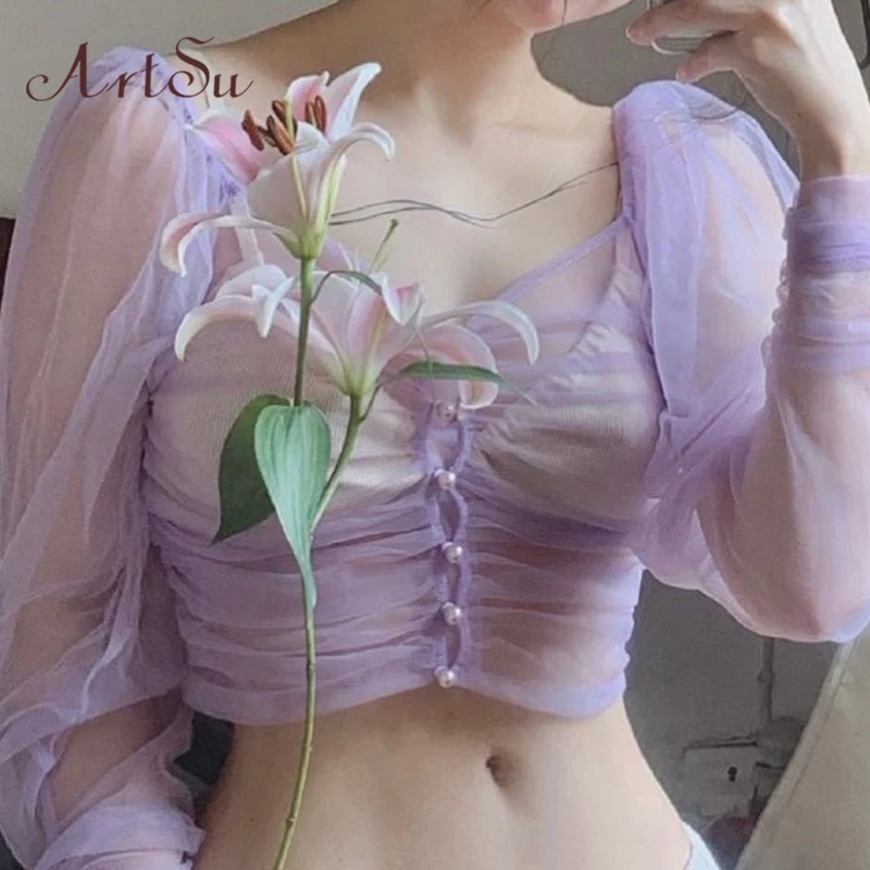 ArtSu фиолетовый сетчатый топ Прозрачная Сексуальная футболка для женщин открытая спина с длинным рукавом укороченная Футболка женская Проз...