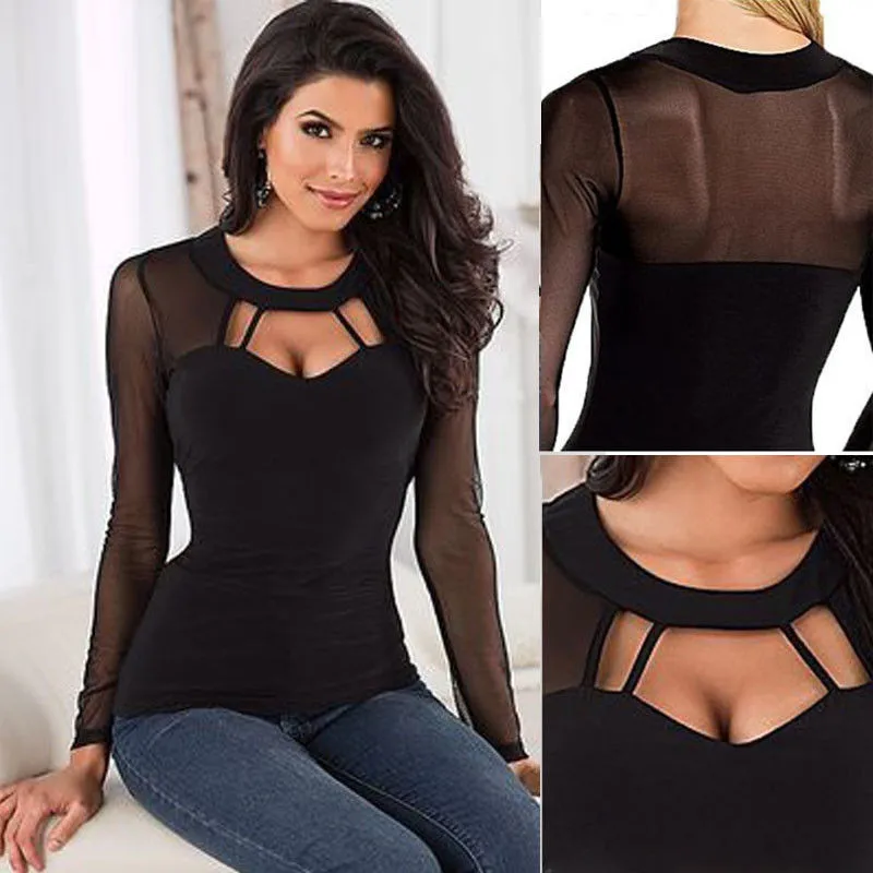 Открытые пикантные Для женщин футболка с длинным рукавом Лето сетки Лоскутная Топы корректирующие износ через топы с длинными рукавами сти...
