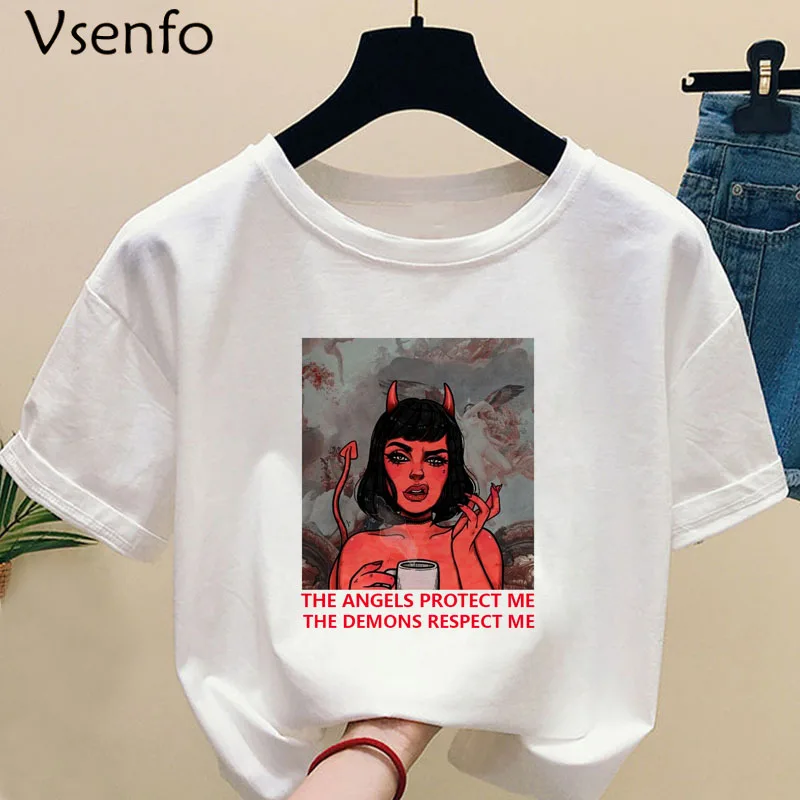 Футболка с принтом «Ангелы защищают меня демоны респект меня» Винтажная футболка с принтом из мультфильма «Дьявол и музыка демонов»