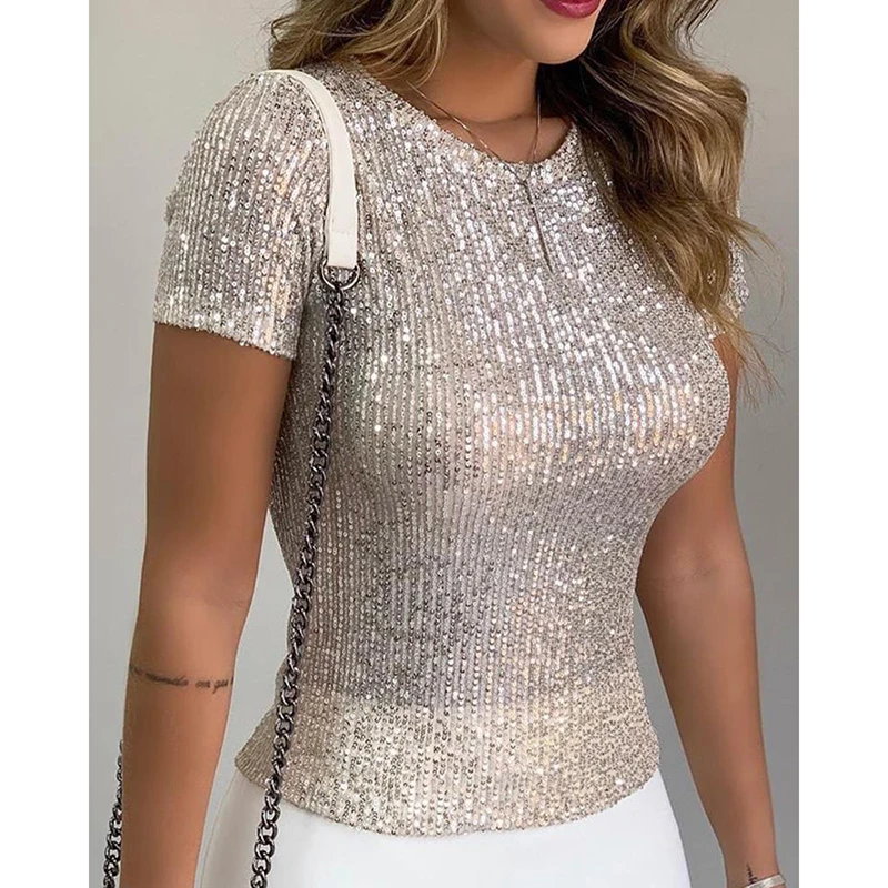 Летняя футболка с блестками и круглым вырезом, женская тонкая футболка с коротким рукавом, Harajuku, эстетическая женская футболка, сексуальные футболки SJ5615V