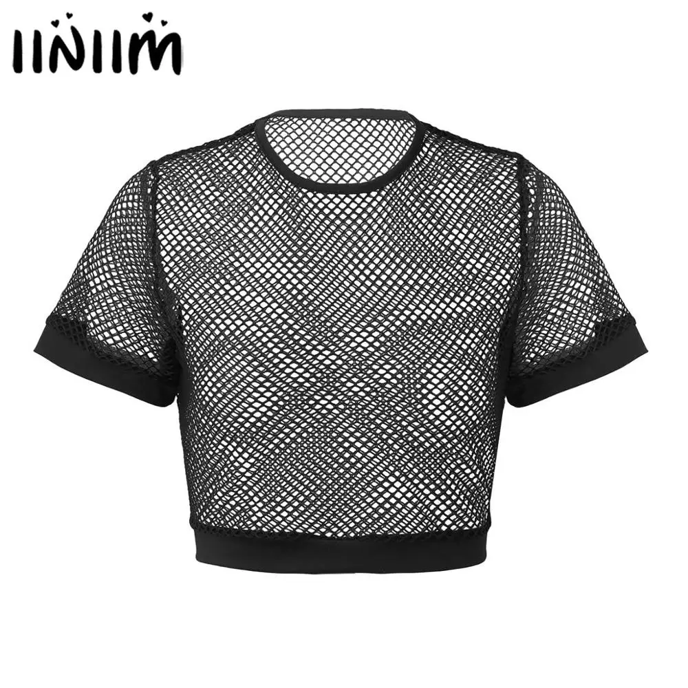 Iiniim Женская Сексуальная Клубная одежда рыболовная сеть прозрачные выдалбливают коктейль с коротким рукавом партии рубашка с полосатым при...