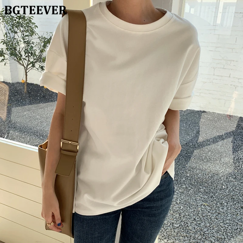 BGTEEVER, однотонная Хлопковая женская футболка, 2020, повседневная, короткий рукав, свободная, приталенная, для женщин, с круглым вырезом, базовые Топы, рубашка для женщин, 6 цветов