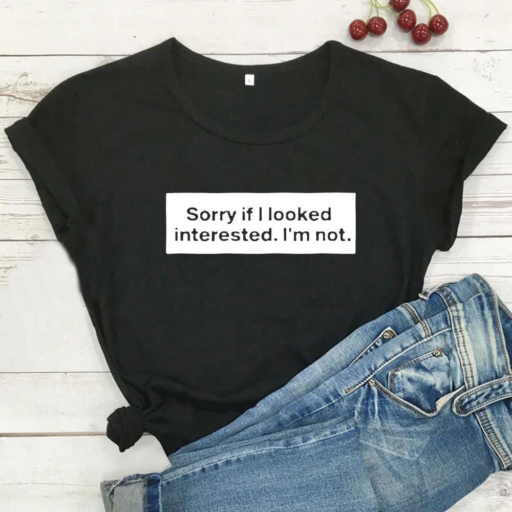 Sorry If I Look Interested Funny T Shirt Women Short Sleeve Tshirt Cotton Women Top Black Tee Shirt Femme O-neck Poleras Mujer