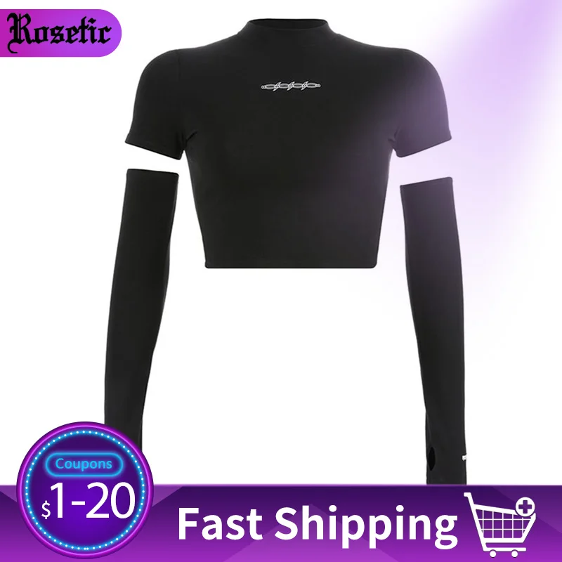 Rosetic гот сексуальный пупок футболки Для женщин летние солнцезащитный Лонгслив укороченный топ Модные принты готический черный для девочек ...