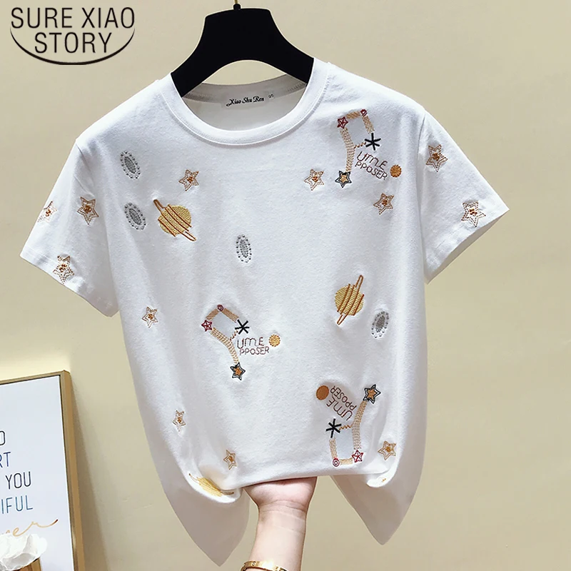 Повседневная черная футболка 2019 корейская белая футболка женская одежда летняя Винтажная футболка с короткими рукавами с вышивкой Женские...