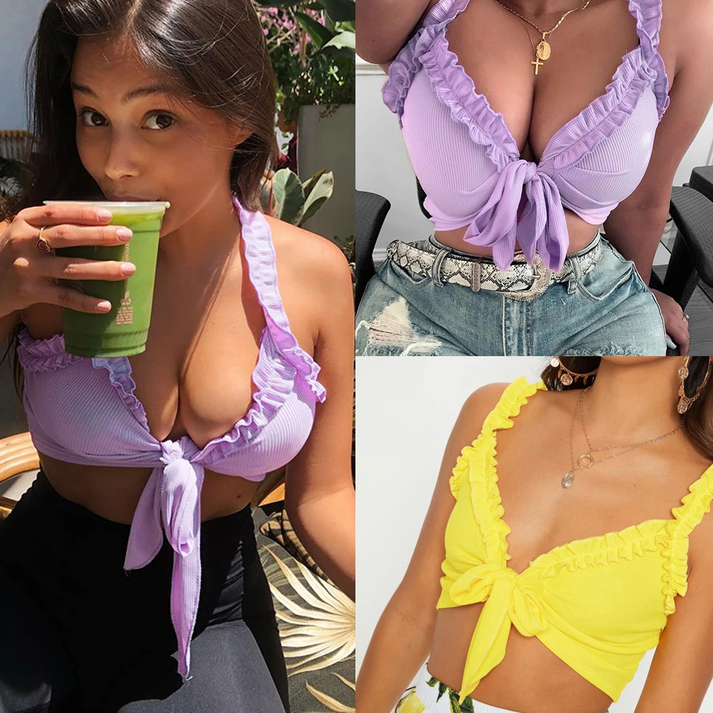 Бюст бант оборки цветок футболка женская одежда 2019 лето сексуальный короткий модный топ уличная однотонная безрукавка жилет