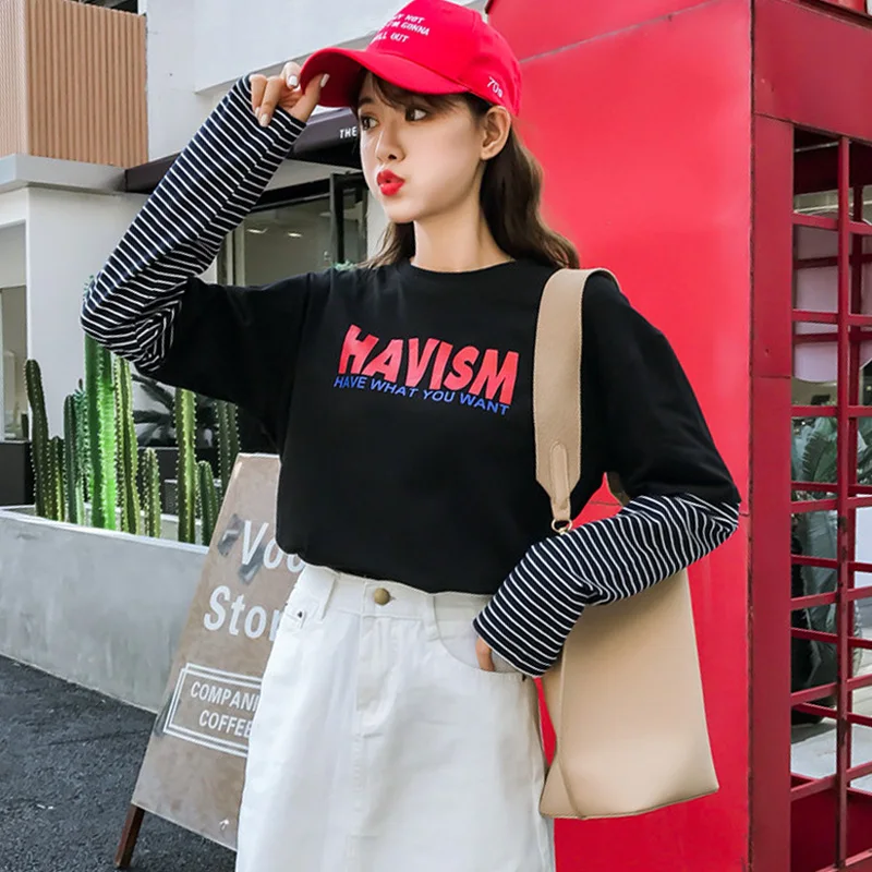 Осень 2018 г. Повседневное футболка с длинными рукавами для женщин s Топы корректирующие корейский стиль для женщин с надписью полосатый шить ...