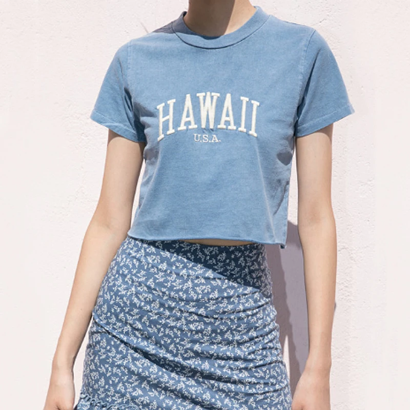 Женская футболка с вышивкой и надписями, с необработанным подолом, с коротким рукавом, из хлопка, синяя