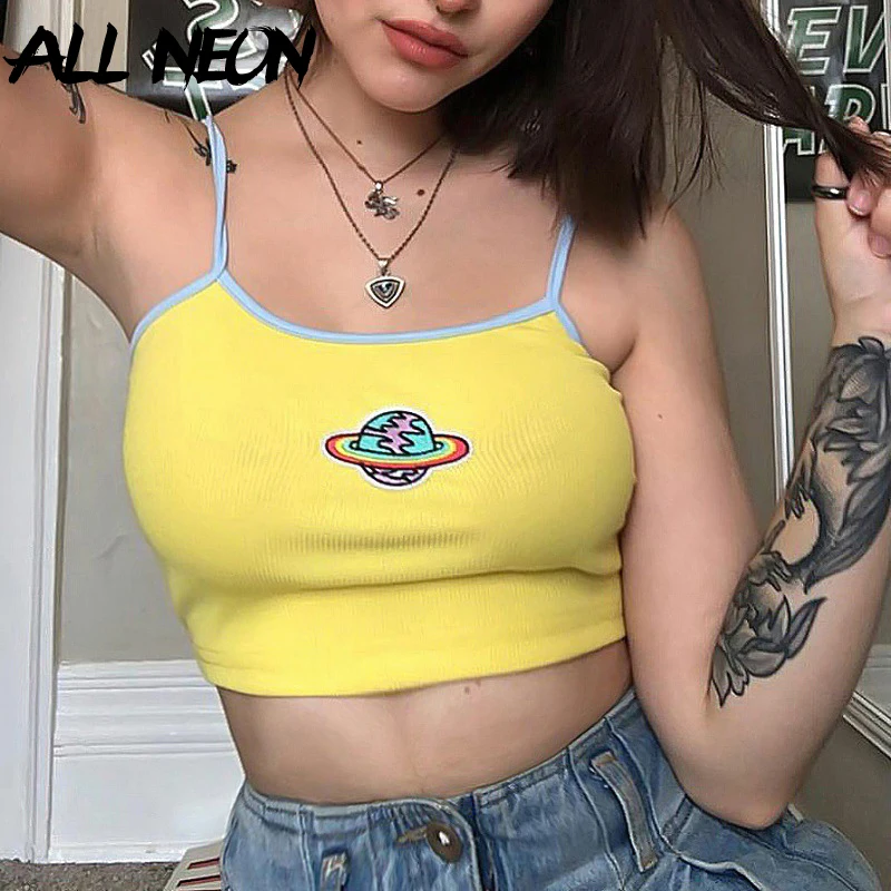 ALLNeon/Лоскутные Топы с бретельками на бретельках, с вышивкой в виде планеты, с открытой спиной, сексуальная майка без рукавов, желтый топ на бретельках для девочек, уличная одежда