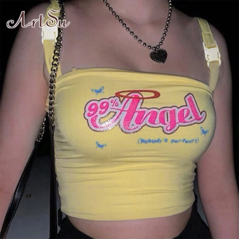 Женский топ с принтом ангела ArtSu, желтый топ на бретельках с милой пряжкой на лето 2020, уличная одежда без рукавов ASVE21081