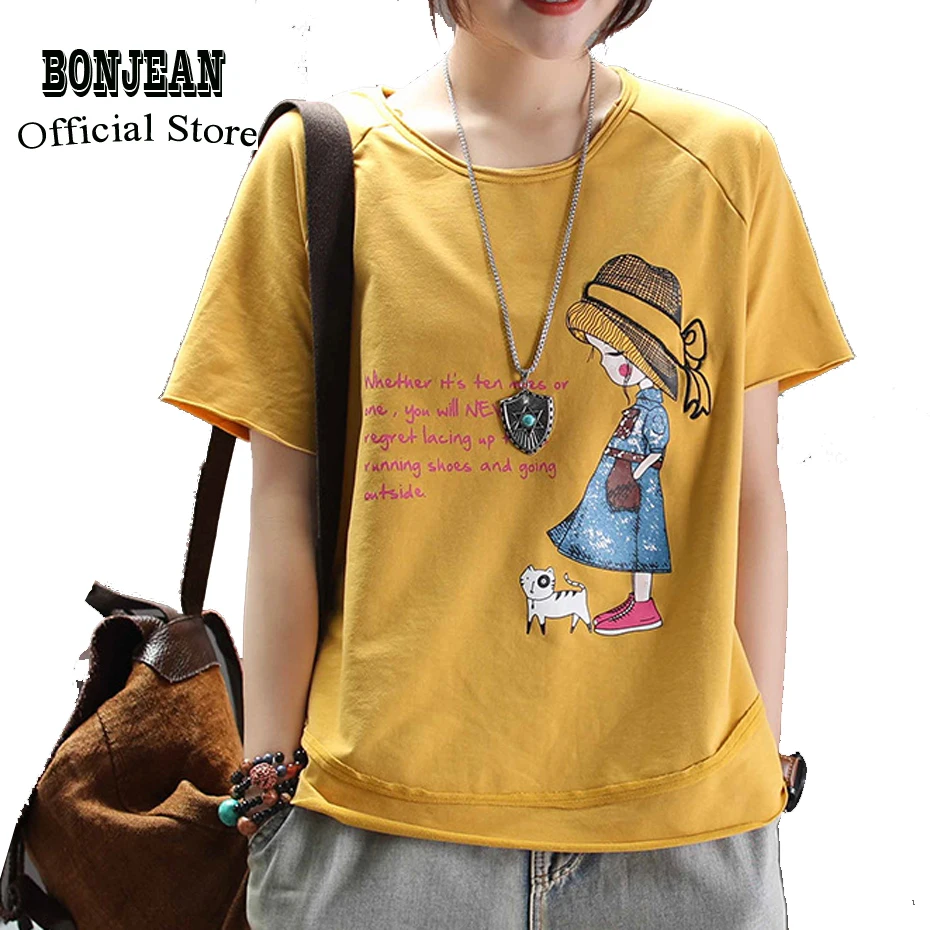 Женские хлопковые топы футболки для дамы Emboridery мультфильм девушка с круглым вырезом свободный большие моды Повседневное милый для лета 66007