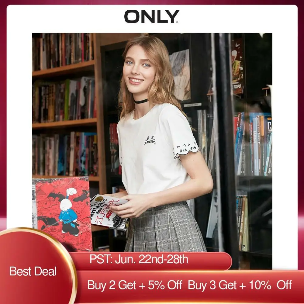 Только Женская хлопковая футболка с короткими рукавами с круглым вырезом и вышивкой кота | 120101592