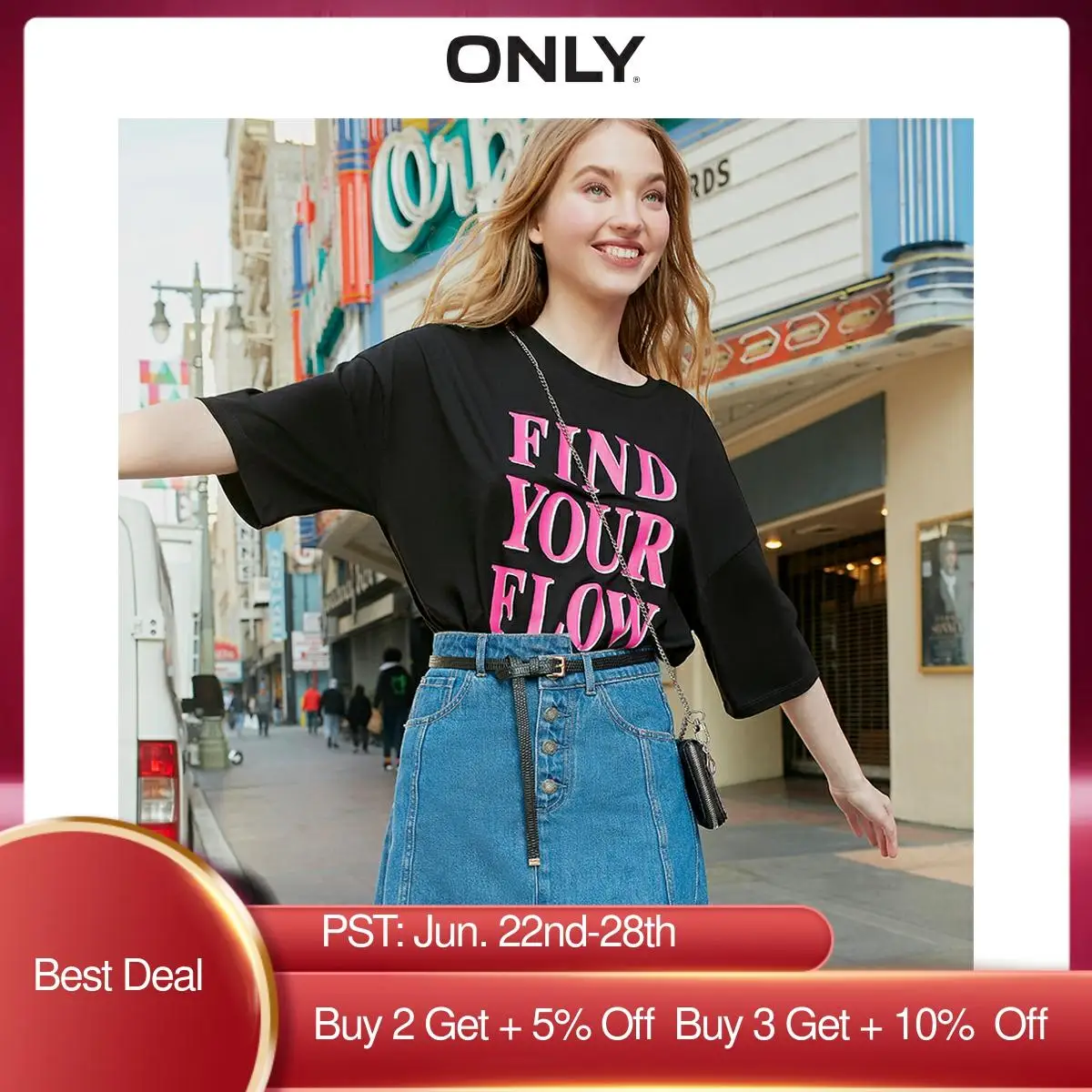 Только Женская свободная футболка средней длины с принтом и короткими рукавами | 120101571