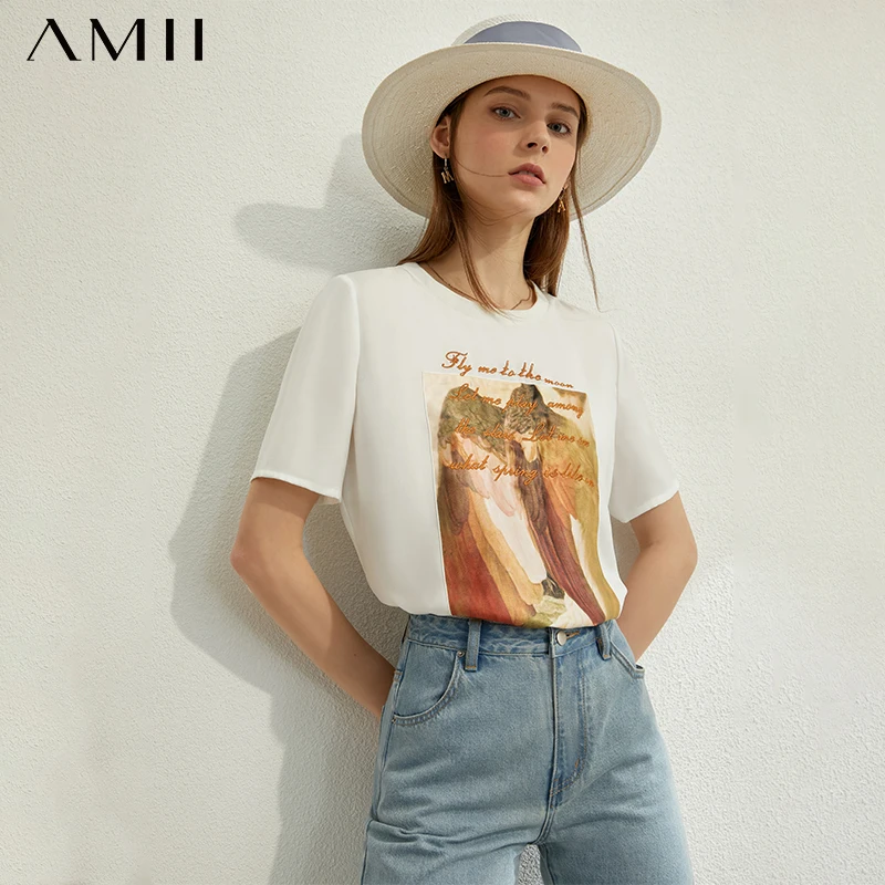 AMII минимализм весенне-Летняя женская футболка с принтом Топы повседневные с круглым вырезом с короткими рукавами свободные женские футболки 12037457