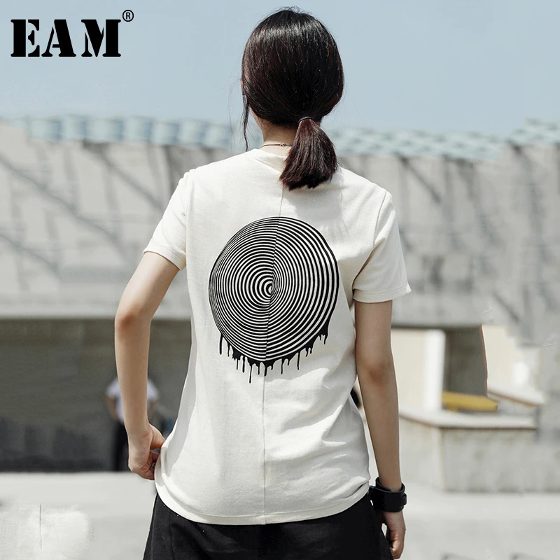 [EAM] 2019 Новый сезон: весна–лето шею короткий рукав Вернуться печатным рисунком свободные личности футболка Для женщин моды прилив JT546