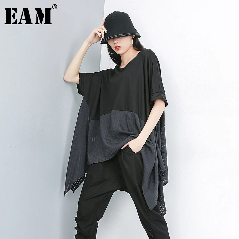[EAM] 2019 Новый сезон: весна–лето шею Половина рукава обратно хит Цвет более Размеры Irreuglar большой Размеры футболка Для женщин Мода JS953