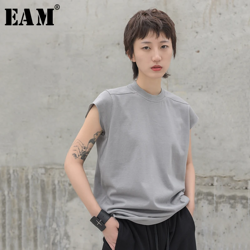 [EAM] 2019 новая весенне-летняя свободная футболка с круглым вырезом и коротким рукавом для отдыха серого цвета с разрезом, женская модная футбо...