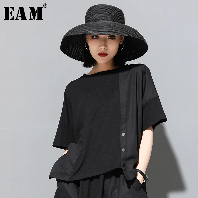 [EAM] 2019 новая весенне-летняя футболка с круглым вырезом и коротким рукавом с черной пуговицей, свободная футболка большого размера, женская м...