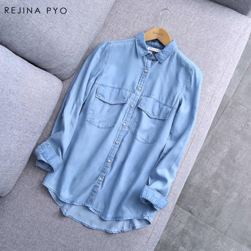 REJINAPYO 2019 Весна новое поступление для женщин синий хлопок джинсовая рубашка Женский Основные Твердые Карманы пуговицы блузка