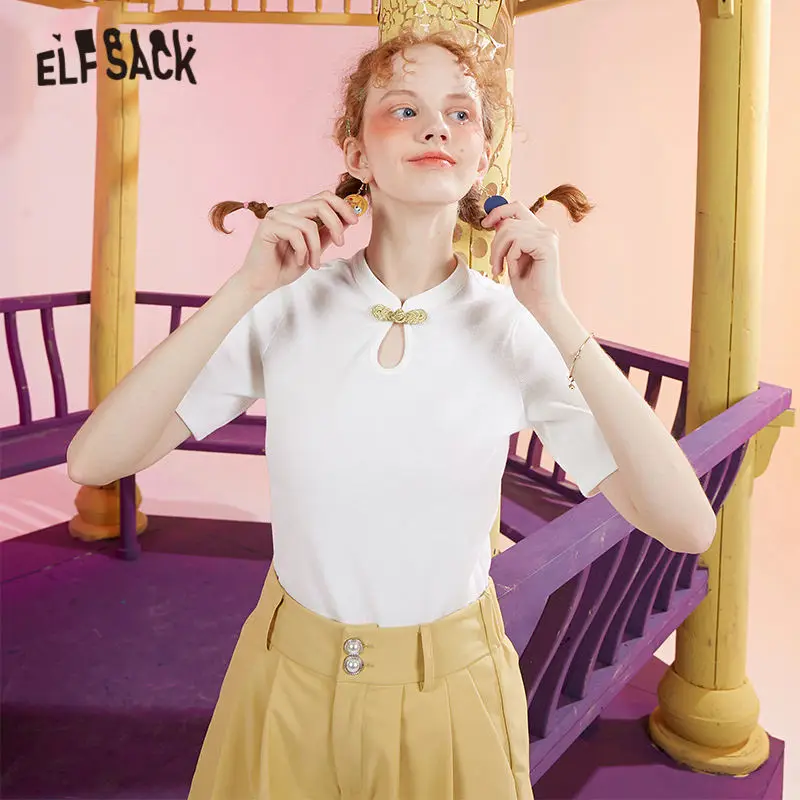 ELFSACK/черные однотонные повседневные женские футболки в китайском стиле с пряжкой, весенние белые женские базовые Топы с коротким рукавом 2020