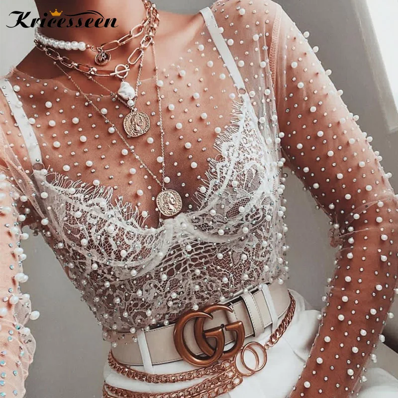 Kricesseen повседневные сетчатые Топы с длинным рукавом и жемчугом для женщин 2020 Весенняя однотонная белая прозрачная короткая футболка