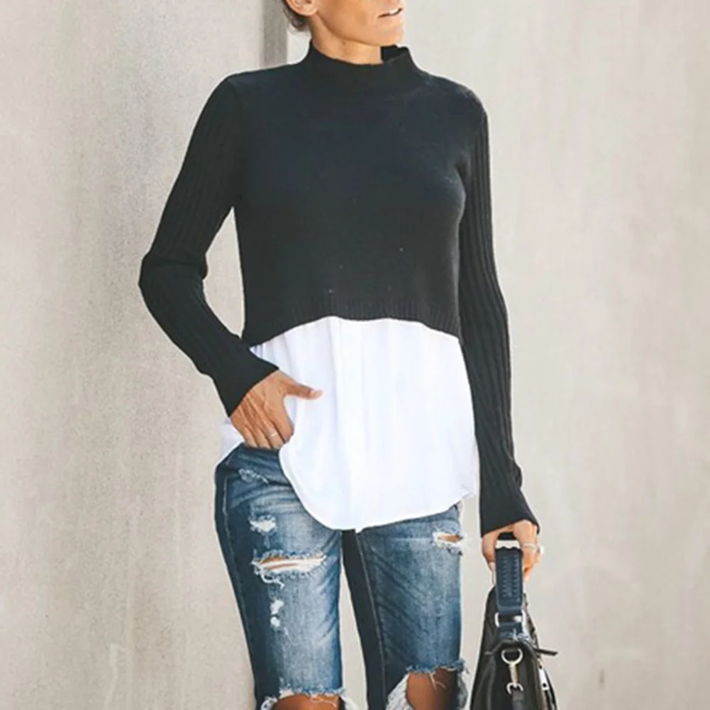 Новые осенние Футболка с длинными рукавами тонкий шить воротник женские хлопок джемпер Мода